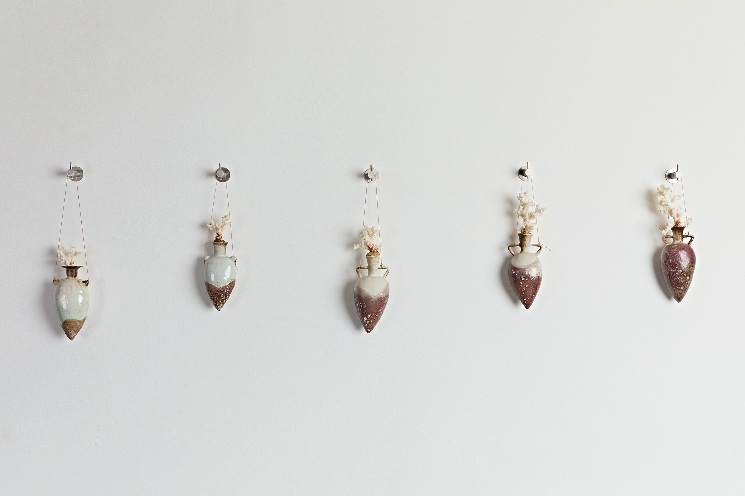 This group of five amphorae have been hand-formed in Porcelain and fired in a wood burning fast fire, with a shino and celadon glaze, hung from stainless steel hooks by linen cord. Each bottle contains a fragment of an antique Barrier Reef Coral.
