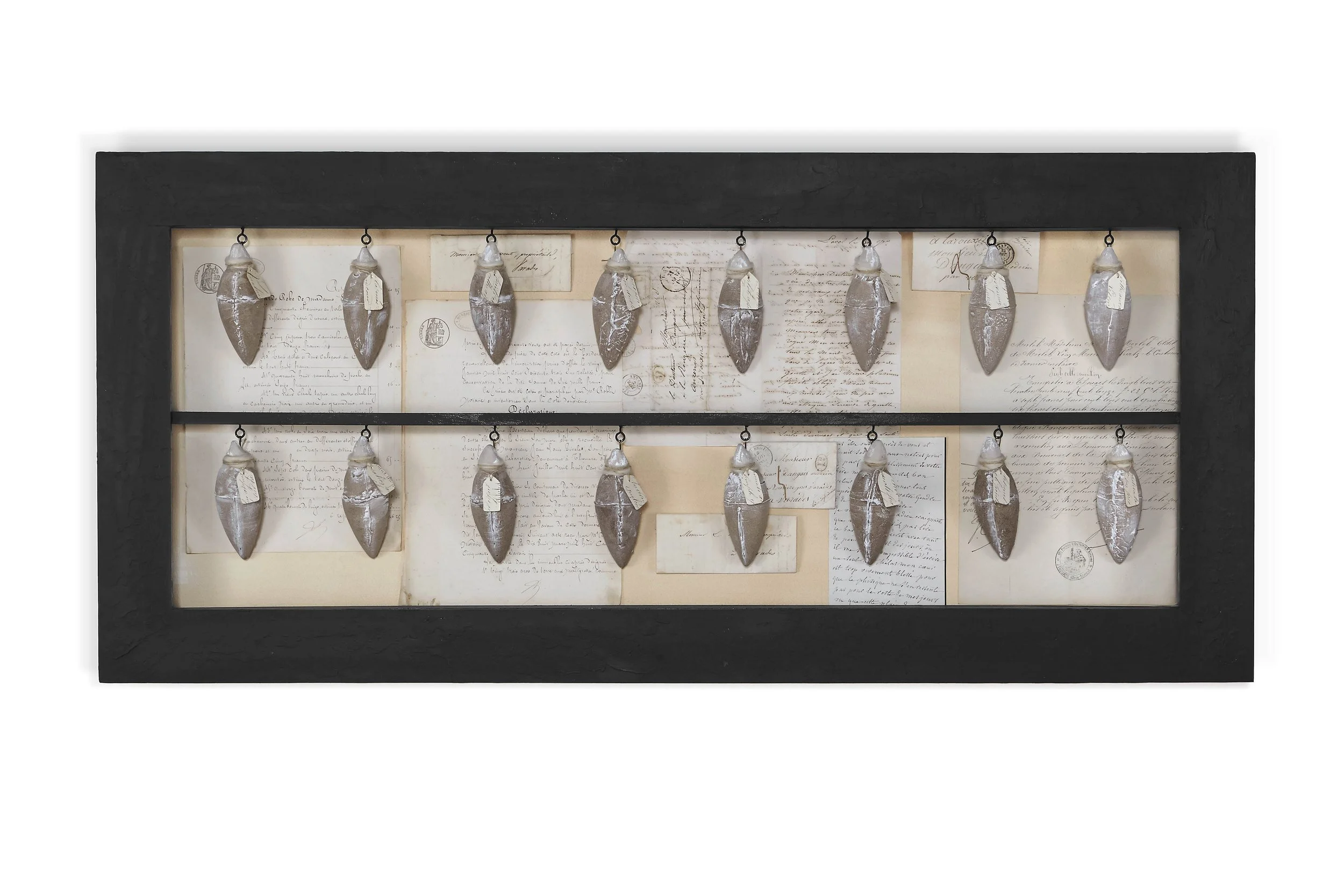 This work is the second piece to be inspired by the discovery of a collection of papers belonging to a 19th Century French doctor. Enclosed within an oak frame are sixteen lachrymatories and several original the letters. The bottles are hand-formed in iron rich stoneware clay and decorated by porcelain slip.