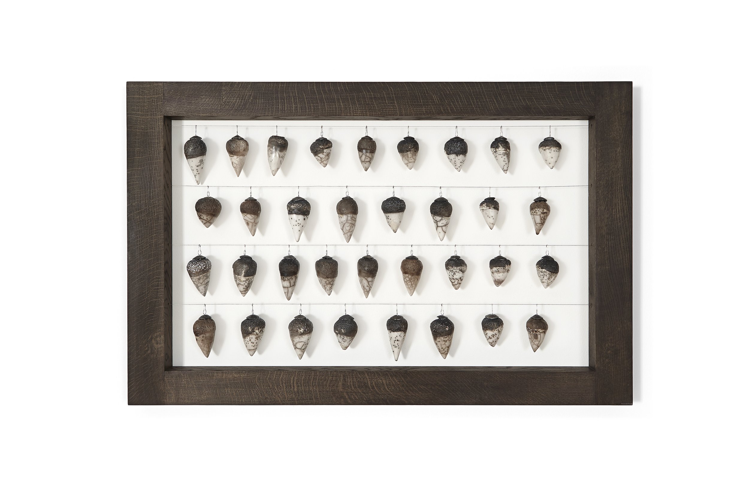 Species Loss is a collection of delicate ‘naked’ raku-fired porcelain forms hung from steel wire within an oak frame.